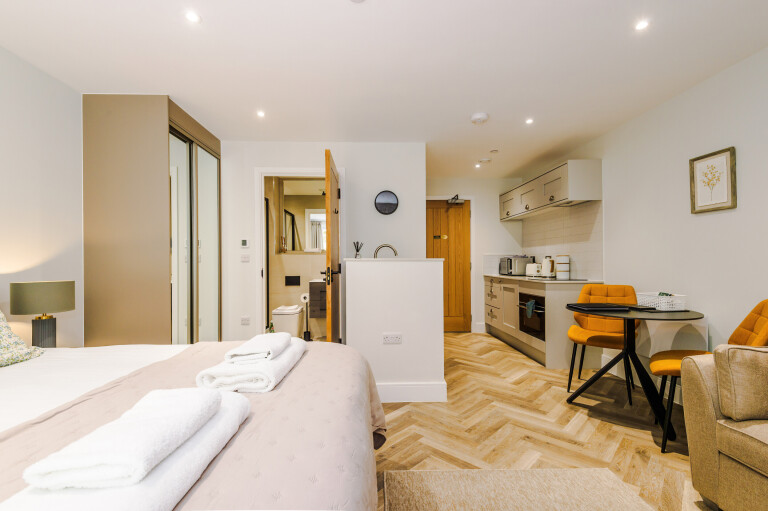 Welcome to our charming studio apartments, nestled in a serene apart-hotel in the heart of the breath-taking Peak District. Each studio offers a perfect blend of comfort and style, featuring a fully equipped modern kitchen, allowing you to prepare your favourite meals with ease. Enjoy the convenience of free on-site…