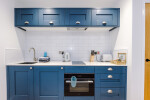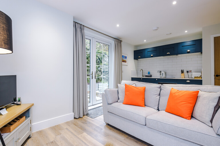 Step inside to find a spacious, thoughtfully designed interior that combines modern comfort with charming character. The open-plan living area is bright and airy, featuring a cosy seating area with a plush sofa, a flat-screen TV, and a fully equipped kitchen. Whether you’re preparing a home-cooked meal or enjoying a relaxing evening, this space is designed to make you feel right at home. The kitchen includes everything you need for a self-catered stay, including a fridge, oven, microwave, and stovetop.