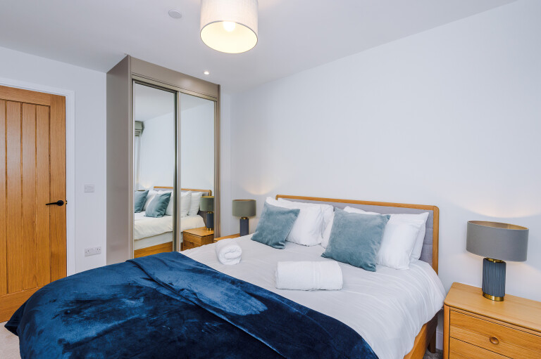 The bedroom is a tranquil sanctuary, complete with a comfortable double bed, high-quality linens, and ample storage space in the wardrobe for your belongings. Large windows fill the room with natural light, offering views of the surrounding area. It’s the perfect spot to unwind after a day of hiking, cycling, or sightseeing.